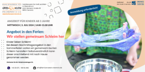 Bei diesem Nachmittagsangebot in den Sommerferien wollen wir gemeinsam bunten Schleim herstellen! Selbstverständlich kann dieser anschließend mit nach Hause genommen werden.