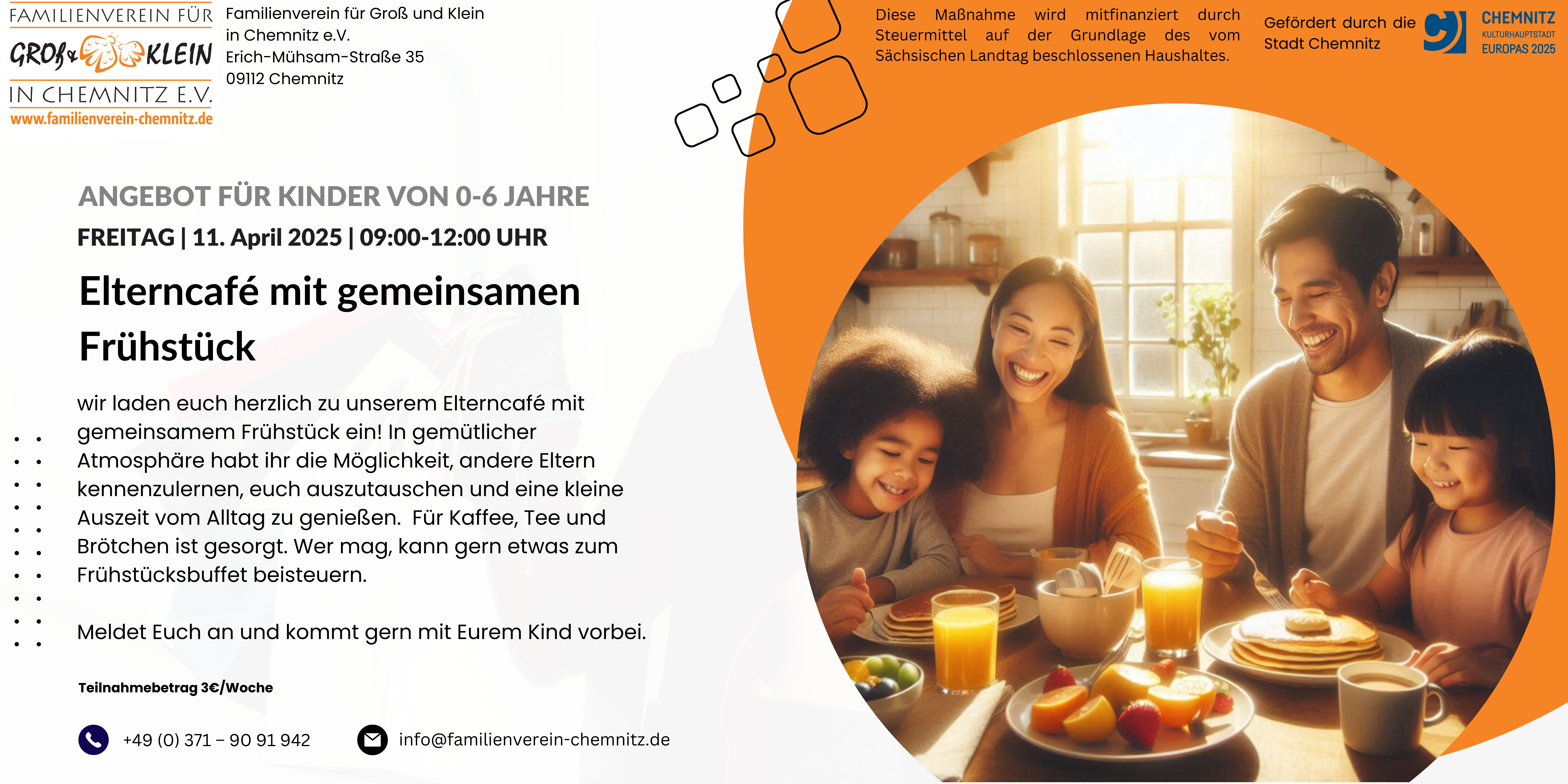 Wir laden Euch herzlich zu unserem Elterncafè mit gemeinsamen Frühstück ein. In gemütlicher Atmosphäre habt Ihr die Möglichkeit, andere Eltern kennenzulernen, Euch auszutauschen und eine kleine Auszeit vom Alltag zu genießen. Für Kaffee, Tee und Brötchen ist gesorgt. Wer mag, kann gern etwas zum Frühstücksbuffet beisteuern.