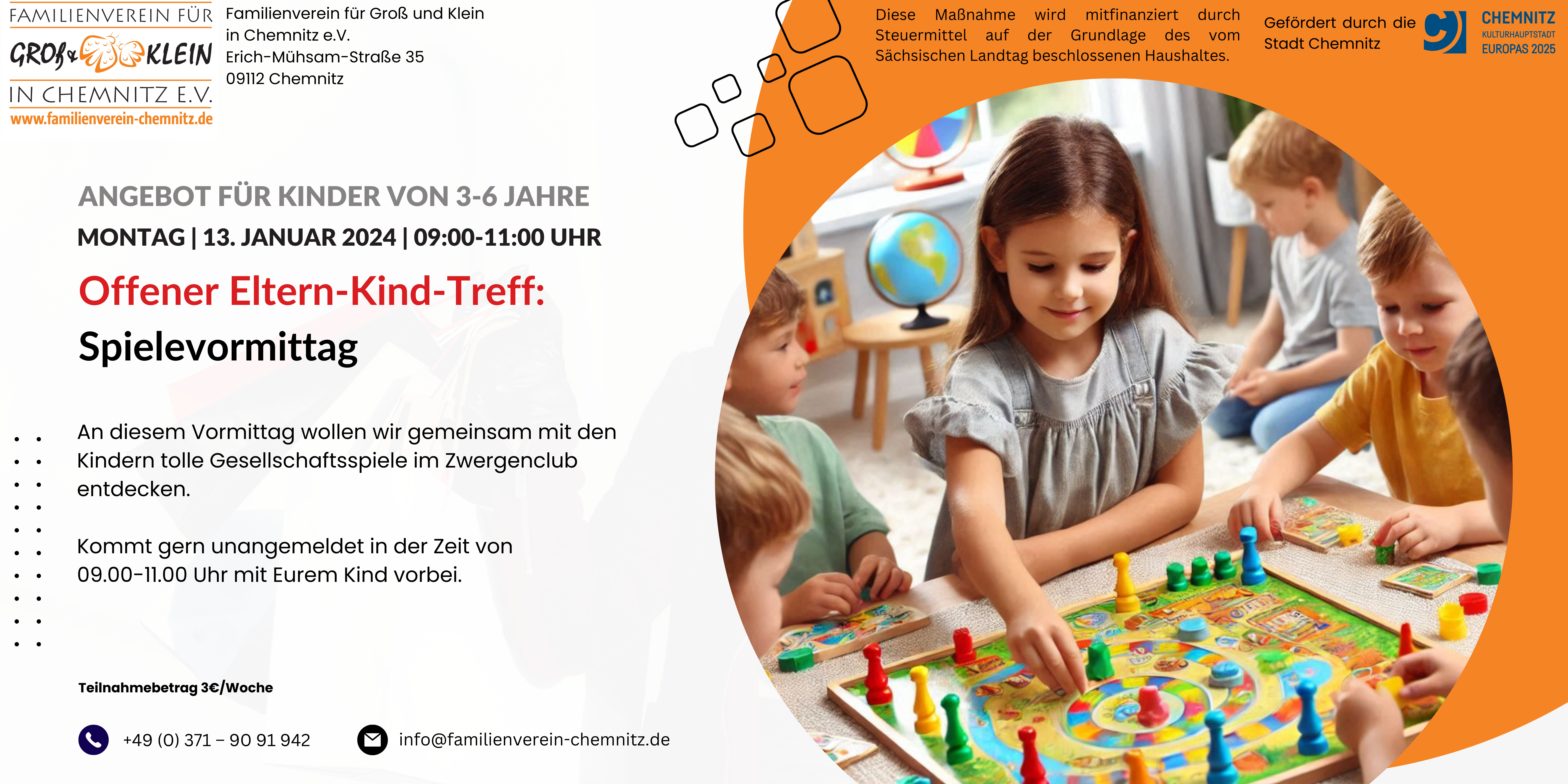 An diesem Vormittag wollen wir gemeinsam mit den Kindern tolle Gesellschaftsspiele im Zwergenclub entdecken. Kommt einfach unangemeldet in der Zeit von 09.00-11.00 Uhr im Zwergenclub vorbei.