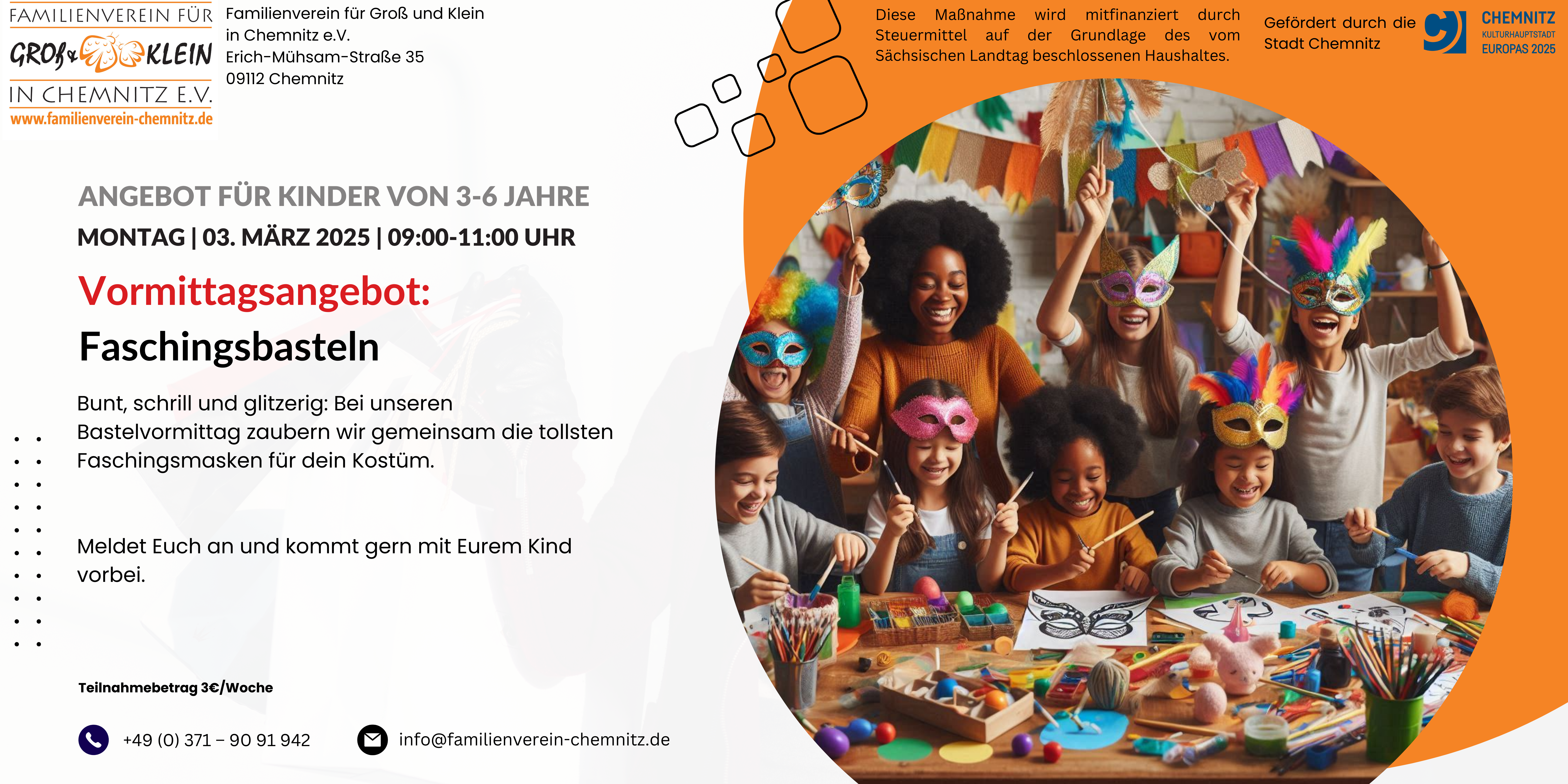 Bunt, schrill und glitzerig: Bei unseren Bastelvormittag zaubern wir gemeinsam die tollsten Faschingsmasken für dein Kostüm.