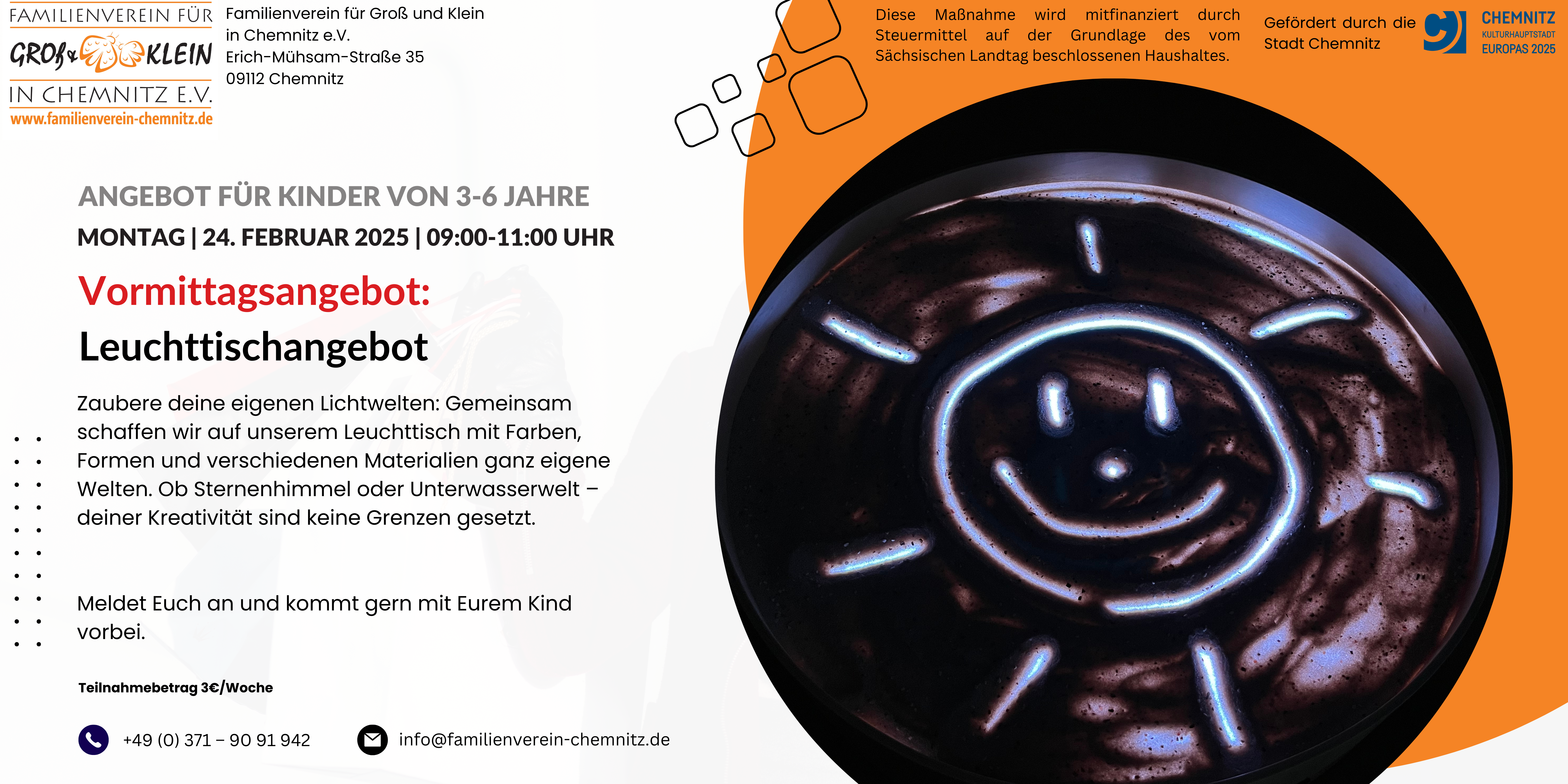 Zaubere deine eigenen Lichtwelten: Gemeinsam schaffen wir auf unserem Leuchttisch mit Farben, Formen und verschiedenen Materialien ganz eigene Welten. Ob Sternenhimmel oder Unterwasserwelt – deiner Kreativität sind keine Grenzen gesetzt.