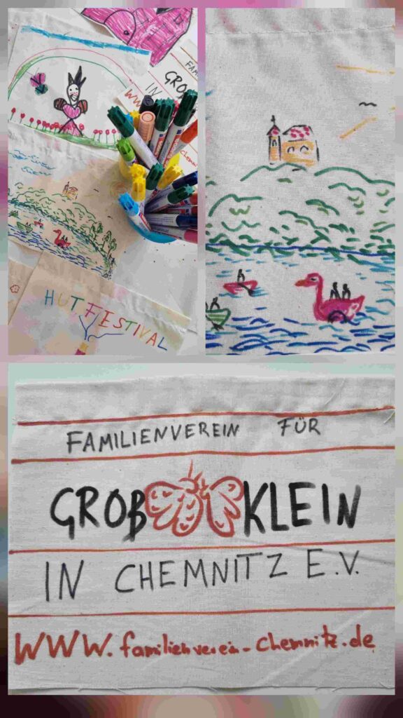 Anlässlich des Kulturhauptstadtjahres darf in Chemnitz auch nicht das jährlich viel geliebte Hutfestival fehlen. Vom 30. Mai bis 1. Juni verwandelte sich die Innenstadt in eine bunte, große Freilichtbühne voller internationaler, facettenreicher Straßenkunst. Natürlich wurde alles zauberhaft dekoriert; so beteiligten wir uns an dem Projekt „Wimpel für Chemnitz“, bei dem tausende Wimpel von Schulen, Vereinen und anderen Einrichtungen von Kindern und Erwachsenen bemalt wurden und schließlich in den Gassen der Innenstadt wehen konnten. Und so wurden auch von uns viele schöne Wimpel gestaltet, bemalt und kreativ umgesetzt. Ein riesengroßes Dankeschön an alle Beteiligten für schöne Malstunden und kreative Treffen.